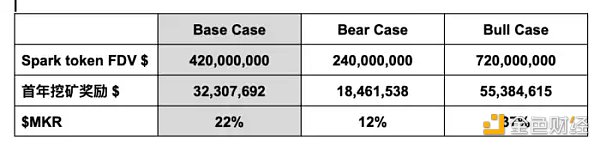 需要注意的是这是一个非常初步且静态的假设,实际 APR 需要等到更多 Spark token 经济模型细节放出,并且也取决于 $MKR 价格的变化。