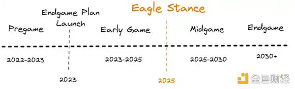 终局计划分为四个阶段,Pregame 阶段团队预期在 2023 年内上线,包括构建 ETHD、上线 MetaDAO 以及启动流动性挖矿等等。