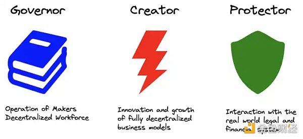 Governor(也叫 Facilitator)负责组织 Maker Core 的去中心化员工管理、链上治理、工程、协议管理和品牌管理等;Creator 专注 Maker 生态链的增长和新功能的开发,如 Spark 团队就属于这个分类;Protector 将负责管理 RWA Vaults,专注与现实世界的资产,保护 Maker 免受对其现实世界资产抵押品的物理和法律威胁。