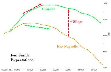 下图是自2月初的非农公布日以来,市场对美联储利率轨迹看法的变化。从中不难看到的是,业内对美联储本轮利率峰值的预估已经创纪录地触及了5.5%,同时对年底的利率预期则已经大幅抬高了约90个基点。