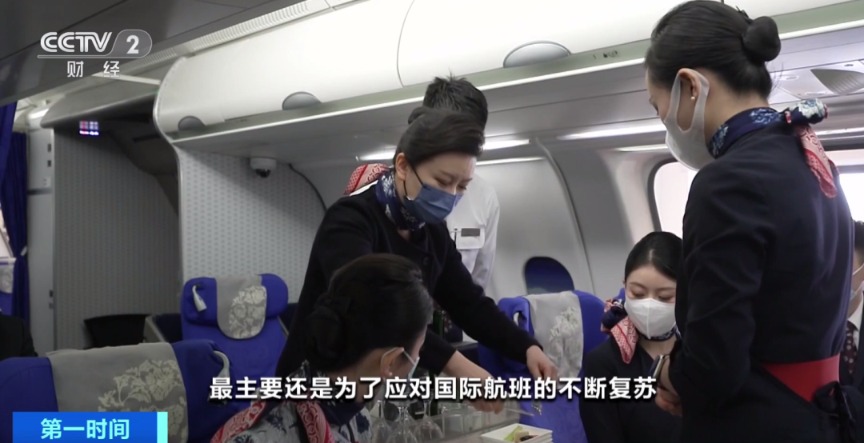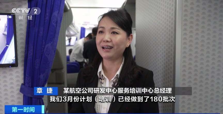 某航空公司研发中心服务培训中心总经理章捷:我们3月份计划培训180批次,培训人次有4100人次,整个培训量都在成倍增长,最主要还是为了应对国际航班的不断复苏。