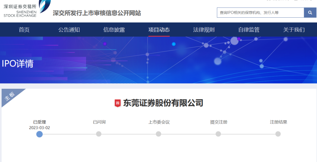 深交所信息显示,东莞证券IPO为“新受理”审核状态,受理日期为3月2日。东莞证券相关人士表示,目前该公司已经收到深交所的受理通知书,后续将按深交所注册制的相关要求进行IPO申请的推进工作。