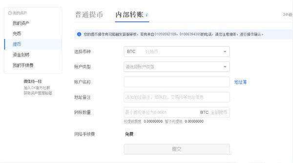 提币分为普通提币和内部转账,普提提币是通过区块确认从而到其他平台的提币(需要网络旷工手续费),内部转账是平台内部进行转账(包括合作交易平台),实时到账不收取手续费。
