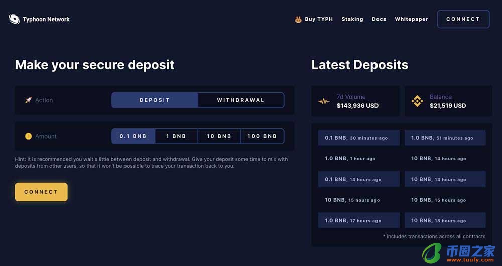 上文中的内容就是小编对于TYPH币发行量和发行价是多少这一问题的具体介绍。Typhoon以隐私和用户信任为核心。我们不断尝试寻找新的方法来改善核心体验,但在当前的BSC生态系统中也做得很好。它拥有低费用,只收取交易的0.1%作为使用服务的费用。这比任何其他可用服务都少10倍。该项目最近还发布了中继功能,允许同一用户同时存款和取款,同时保持匿名。这使得无需首先向BNB注入资金就可以将资金存入新钱包,以支付交易费用。