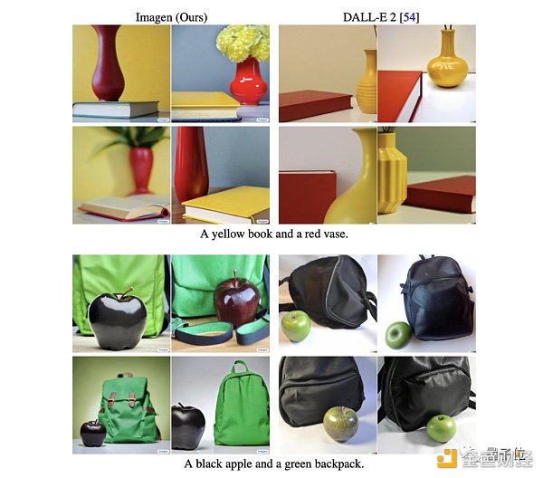 比起爆火的DALLE-2,Imagen能更准确地理解同时出现两个颜色要求的情况: