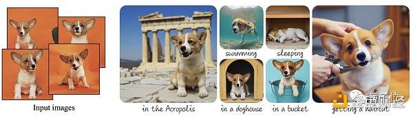 后来在Imagen上微调,谷歌还推出了能“指哪打哪”版本的文生图模型DreamBooth。只需上传3-5张指定物体的照片,再用文字描述想要生成的背景、动作或表情,就能让指定物体“闪现”到你想要的场景中。