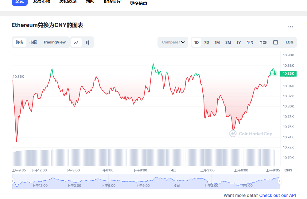 Ethereum 今日价格 为 ¥10,871.33 CNY,其 24 小时的交易量为 ¥67,481,293,400 CNY。 我们会实时更新ETH兑换为CNY的价格。 Ethereum 在过去 24 小时内下跌了 4.19。 目前的 CoinMarketCap 排名为第 #2 位,其市值为 ¥1,330,366,609,186 CNY。 其流通供给量为 122,373,866 ETH 个货币 目前无法提供供给量上限信息。