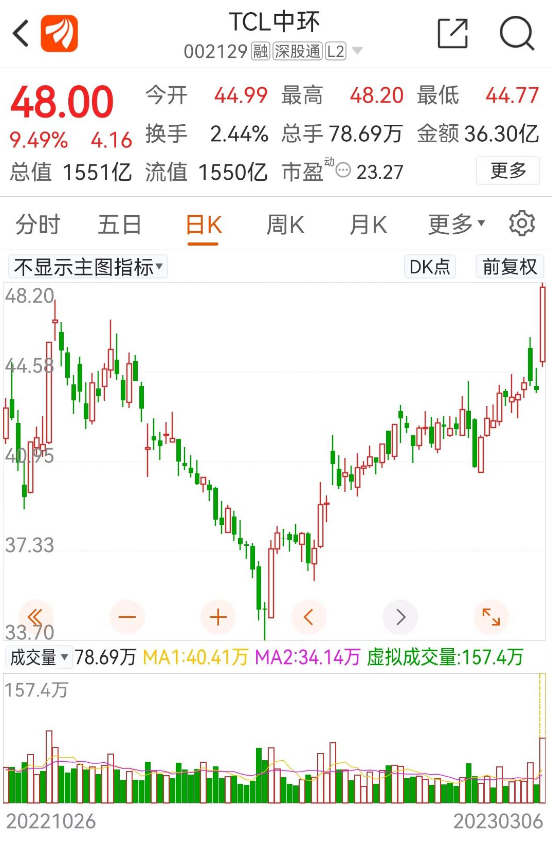 1500亿市值的大尺寸硅片龙头股TCL中环盘中爆拉,截至午间收盘大涨9.5%,成交金额超36亿元。