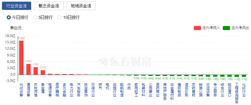 行业资金方面,截至午间收盘,光伏设备、通信设备等净流入排名靠前,其中光伏设备净流入超15.9亿元。