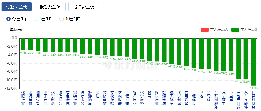 净流出方面,计算机设备、汽车零部件等净流出排名靠前,其中计算机设备净流出11.3亿元。