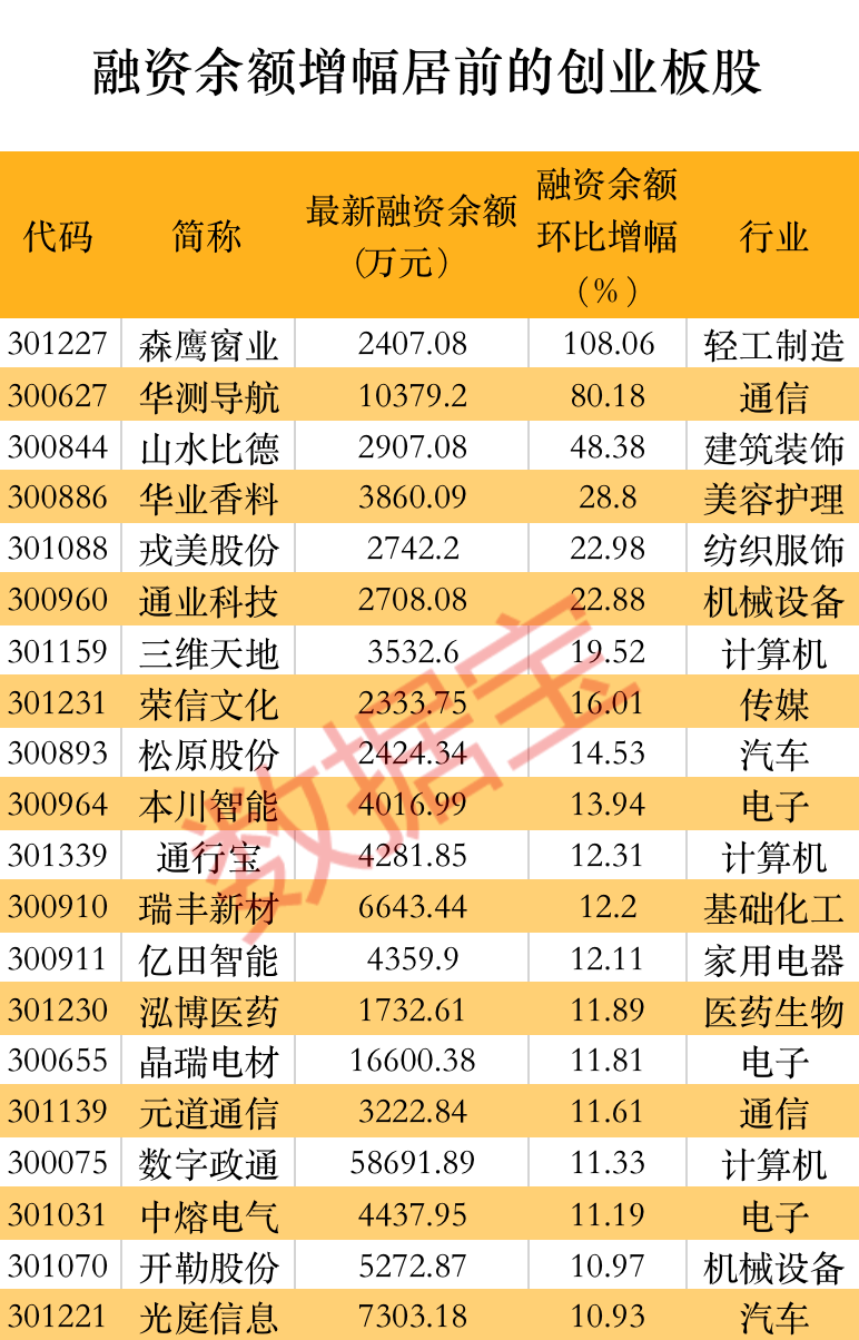 从创业板情况来看,融资余额增长的创业板股有340只。其中,20股融资余额增幅超过10%。增幅最大的是森鹰窗业,该股最新融资余额2407.08万元,环比增幅为108.06%。森鹰窗业是家居细分龙头,主营铝包木窗,机构表示,公司未来增长驱动力充足,收入端来看,公司正逐渐加大C端开拓。