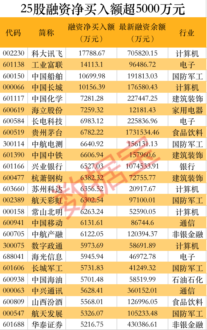 科大讯飞融资净买入额居首,当日净买入1.78亿元,其次是工业富联、中国船舶,融资净买入金额分别为1.41亿元、1.07亿元,融资净买入金额居前的还有中国长城、中国化学、海立股份等。