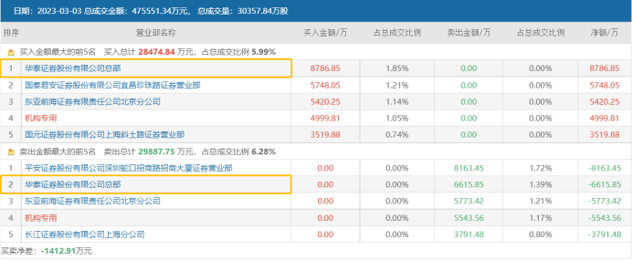 从资金面来看,量化基金与多家机构的加持也助力中国卫通近日的股价爆发。以中国卫通最新(3月3日)龙虎榜数据显示,其当日上榜营业部席位全天成交47.6亿元,且单日净卖出近1400万元。买入榜前五席位中,量化基金常用席位华泰证券总部净买入近8800万元,一家机构专用席位净买入近5000万元。不过,在卖出榜中,华泰证券总部同样在列,其以8200万元的净卖出位居第二席位。