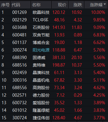 以光伏为代表的新能源赛道今日回暖,光伏、储能、TOPcon电池、风电等板块领涨。截至收盘,欧晶科技涨停,TCL中环、石英股份涨逾9%,阳光电源、晶澳科技、固德威等涨逾5%,“光伏茅”隆基绿能涨近4%。数据显示,3月6日光伏板块总市值近3万亿元。