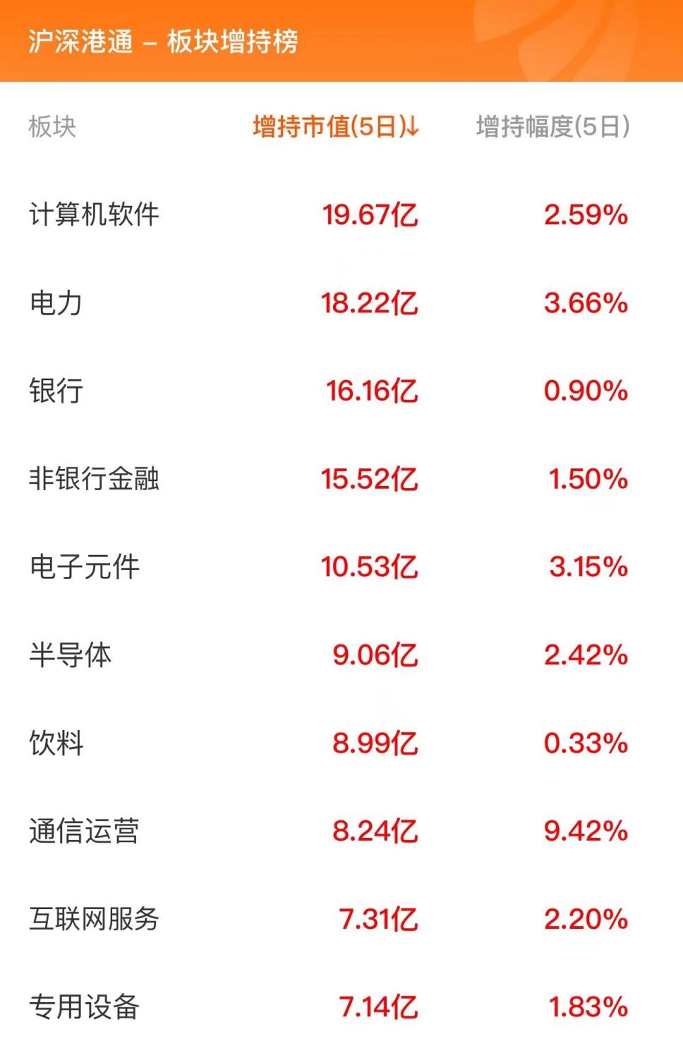 数据显示,近五个交易日,北向资金增持计算机软件板块19.67亿元,增持电力板块18.22亿元,增持银行板块16.16亿元。此外,林业板块近五日增持幅度最大,达20.63%。