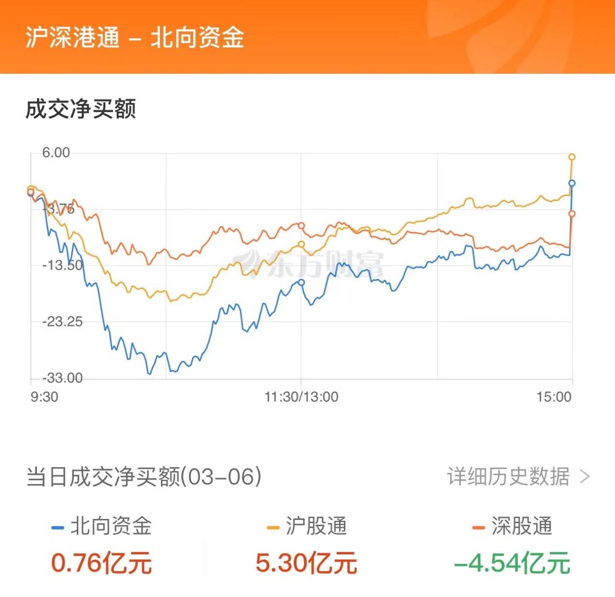 3月6日,大盘全天震荡分化,沪指小幅调整,创业板指探底回升小幅上涨。北向资金当日净流入0.76亿元,其中,沪股通当日成交净买额5.30亿元;深股通当日成交净卖出4.54亿元。上周五,北向资金净流入20.66亿元。