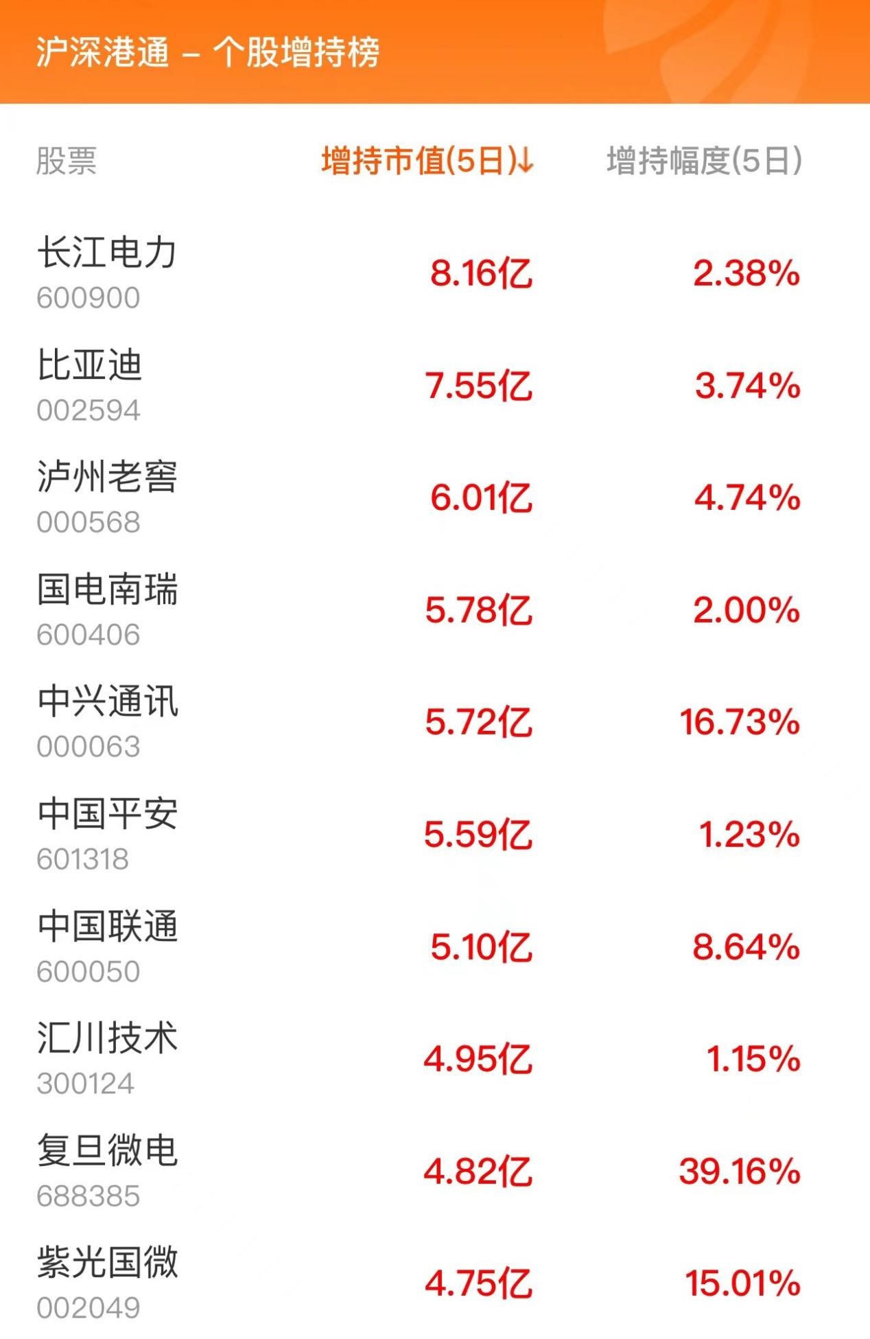 数据显示,近五个交易日,北向资金增持长江电力8.16亿元,增持比亚迪7.55亿元,增持泸州老窖6.01亿元。此外,新莱应材近五日增持幅度最大,达326.78%。