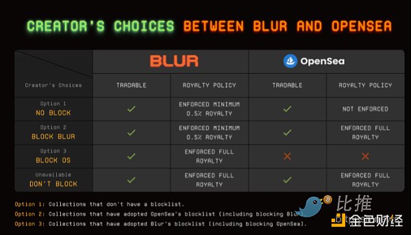 OpenSea 已通过多种方式应对 Blur 威胁。最初,由于 Blur 缺乏完整的创作者版税执行,他们禁止在 OpenSea 上铸造的 NFT 出现在 Blur 市场上。然而,在 Blur 在交易量方面超过 OpenSea 后不久,他们改变了策略,即退出了“零费用”模式,并提供可选的创作者版税。这一决策是在Blur发布了一篇博客文章后发生的,文章中指出NFT创作者必须选择OpenSea或Blur,并推荐收藏品拒绝OpenSea以选择其他市场。OpenSea的快速反应表明他们认为Blur是对他们业务的严重威胁,并愿意在短期内放弃收入,以与Blur竞争交易量和用户。