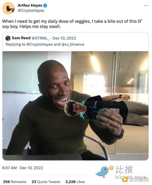 Hayes 称他回归的本意并不是要填补加密领导层的空白。「这不是加密货币的意义,它不应该以经营公司的极少数人为基础。」他正以另一种方式回归,作为评论员和市场推动者通过一个有影响力的博客和推特账户发声,而这些都是加密货币信徒必读的。Hayes 写了三篇关于FTX 倒台的文章,其中一篇题为 「白人小子」的文章,讲了 SBF 是如何利用他的先天优势和超强的社会智慧来欺骗大家,使他们认为他是一个加密货币奇才、是西方主导金融机构的未来 。他还在推特上继续谴责,配了一张似乎要咬 Bankman-Fried 剪纸的图片,嘲讽 Bankman-Fried 吃素的习惯。
