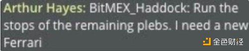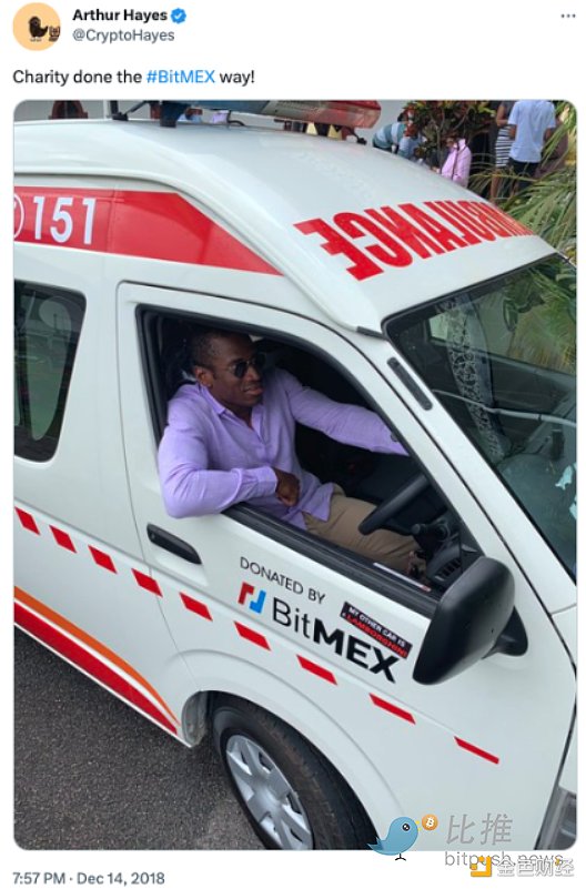 该言论似乎佐证了当时一种普遍的(未经证实的)看法,即 Hayes 在操纵市场,并与客户进行交易。他并没有刻意回避关于汽车的事情。在 2018 年底,他在一辆 BitMEX 捐赠给塞舌尔的救护车上贴了一张保险杠贴纸。他的另一辆车是一辆兰博基尼。他还购买了一辆黄色的法拉利波托菲诺。车迷们认为该车型是为那些实际上不懂汽车的人准备的跑车,Hayes 的内部圈子里有人戏称它是 「娘娘腔的法拉利」。Hayes 也讨厌驾驶它。他说「我不是一个喜爱汽车的人,我在停车场撞了两辆车。」