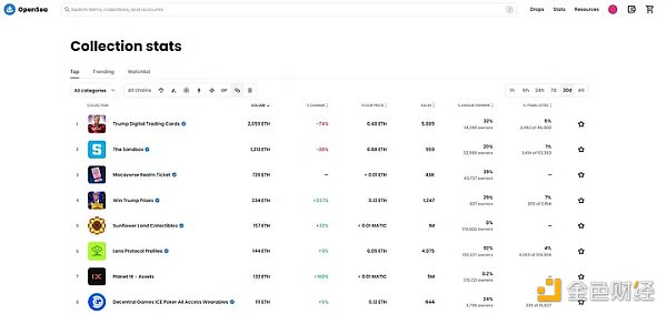 OpenSea 是以太坊上的代表性市场,支持多条链。目前,它在 Polygon 上的交易量最高。交易量高的流行项目包括:Trump cards、The Sandbox 和 MocaVerse。