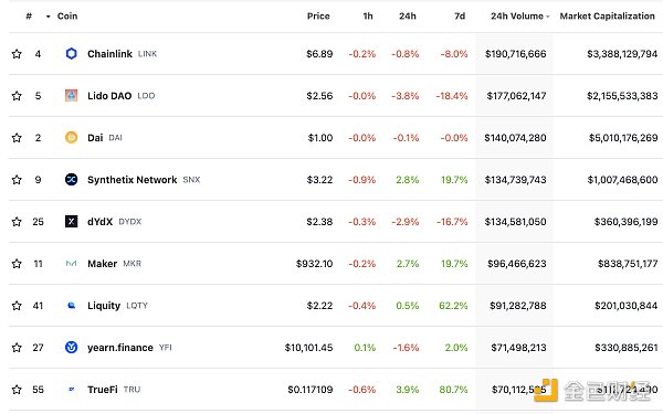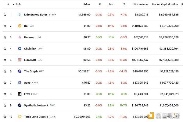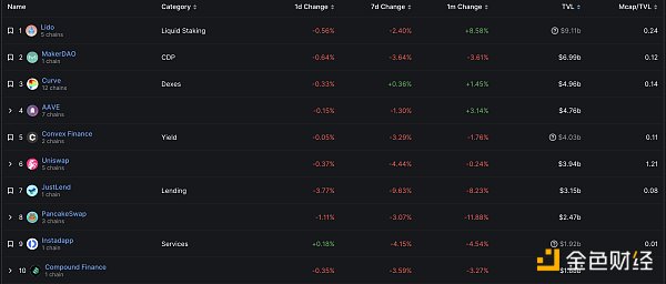 DeFi项目锁定资产前十排名及锁仓量 数据来源:defillama