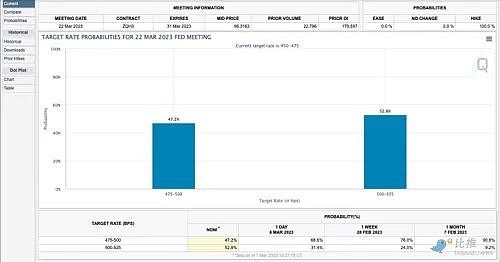 根据 CME Group 的FedWatch利率预测工具,鲍威尔发表上述言论后,交易员押注美联储3月加息 50 个基点的可能性升至 51.3%,这比一天前的 31.4% 和一个月前的 9.2% 大幅上升。此前市场普遍预计,美联储将维持其在 2 月 1 日通过的 25 个基点的加息幅度,放缓 2022 年的激进加息举措。