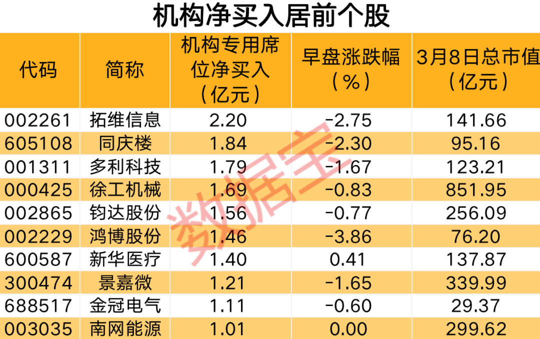 部分机构净买入股早盘表现较好,上海电影收获2个涨停,公司3月8日龙虎榜显示,机构登上买一席位,全天净买入2212.34万元,公司近期公告拟收购上影元文化,有助于通过资源整合拓展IP运营业务,提升公司盈利能力及市场竞争力。