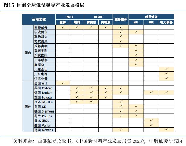 从全球低温超导产业发展格局来看,部分公司专注于低温超导产业链中的某一环节,其余公司横跨多个环节。涉及的产业链企业包括:西部超导、宁波健信、潍坊新力等。