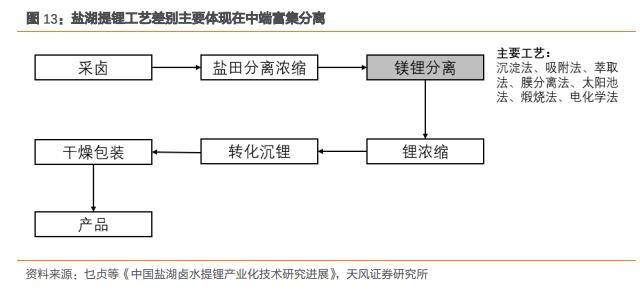 盐湖提锂的全过程包括前端卤水开采、中端富集分离、后端产品转化三个环节。前端和后端的操作流程相对统一,工艺的差别主要体现在中端富集分离环节。