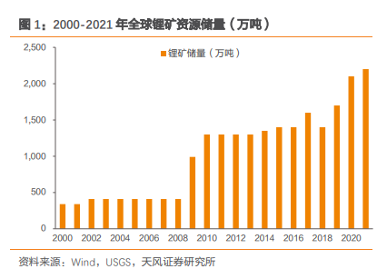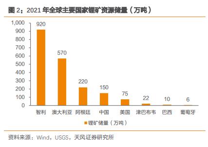 统计显示,截至2021年末,全球锂矿储备量达2,200万吨,同比2020年增长 4.76%。2021年,智利、澳大利亚、阿根廷、中国和美国的锂矿资源储备量位居前五,储备量分别为920万吨、570万吨、220万吨、150万吨和75万吨,前5国家累计储备量占比达87.95%。