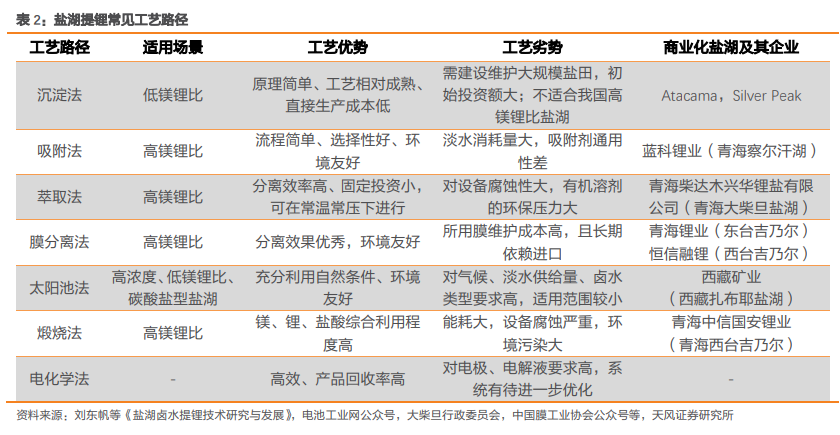 天风证券研究团队表示,盐湖中锂的富集分离可通过多种方式实现。目前国内盐湖提锂的技术路线主要有沉淀法、吸附法、萃取法、膜分离法、太阳池法、煅烧法、电化学法等。