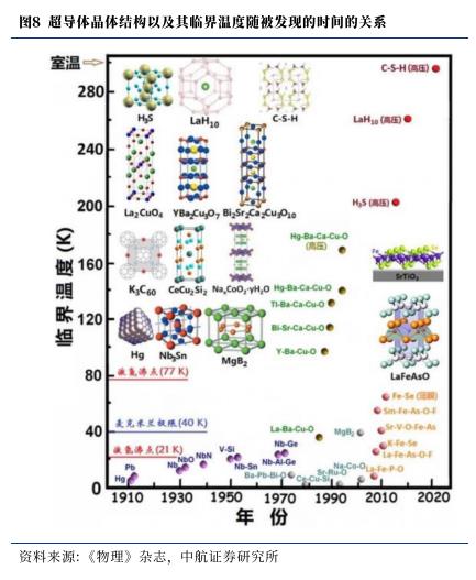 中航证券研究团队提到,回顾超导体的发展历史,超导研究对象逐步由简单金属到合金,再到复杂的化工物、有机物,超导临界温度也在过去的一个多世纪里逐渐提升。