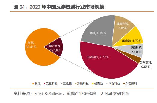前瞻产业研究院依据各公司年报数据对反渗透膜市场份额进行了测算,结果显示沃顿科技、三达膜、津膜科技、唯赛勃等为我国反渗透膜主要生产商,其中沃顿科技为龙头企业,2020年市场份额约为7.77%。市场集中度方面,国产反渗透膜企业市场集中度较低。