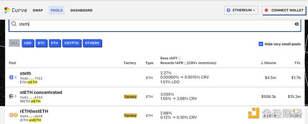 我们可以看到Lido的stETH在Curve上的交易对ETH-stETH的TVL为17亿美金,日交易量450万美元。