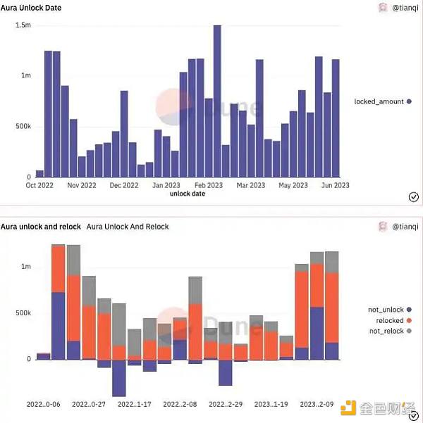 最近的解锁的 vlAURA 的 70-80% 都进行了再次锁定,几乎没有卖出。像 Gnosis、Badger 和 Messi 这样的大户都是长期持有的,他们每几周都会不断累积锁定 AURA。