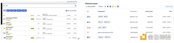 目前 Balancer 流动性最大的前三个池子分别为 wstETH/WETH、BAL/WETH、rETH/WETH,第二名是与 veBAL 相关,另外两个池均为 LSD 相关(Lido 和 Rocket Pool)。