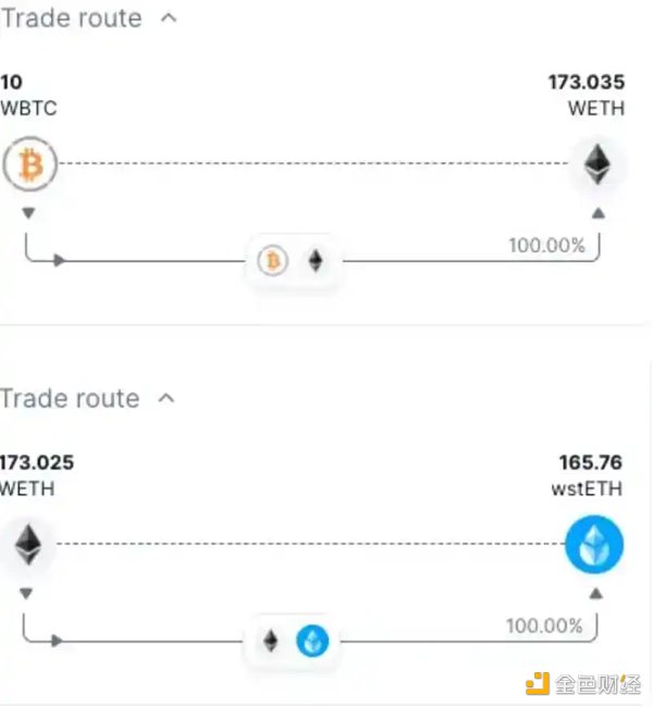 比如,下图是 BTC 和 stETH 之间的示例(可以看到其中的 Gas 消耗很高)。