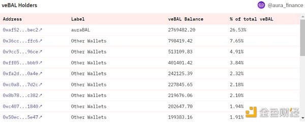 数据显示,目前 veBAL 已铸造总量约为 1044.49 万,其中 Aura 是排名第一的持有者,持有约 276.95 万 veBAL,占比约 26.53%。