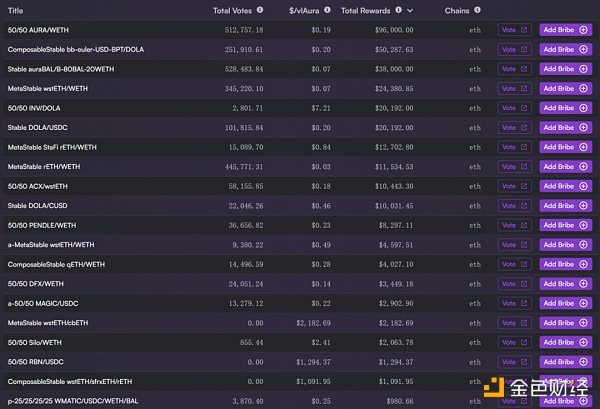 目前可以在 Hidden Hand 平台为 BAL 奖励分配权重的选举进行贿赂,吸引 vlAURA 的持有者投票给对应的池子。