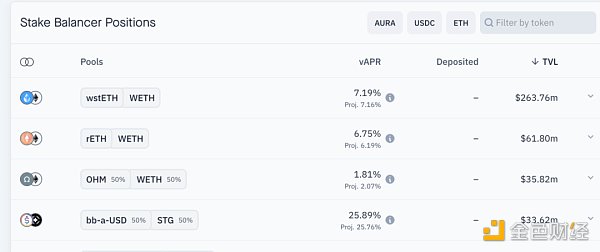 上图左边是Curve,右图是Balancer,下图是Aura Finance,很明显能够看出Aura Finance的rETH-WETH的收益率高达6.75%,相比其他两个平台的收益将近是两倍的差距。
