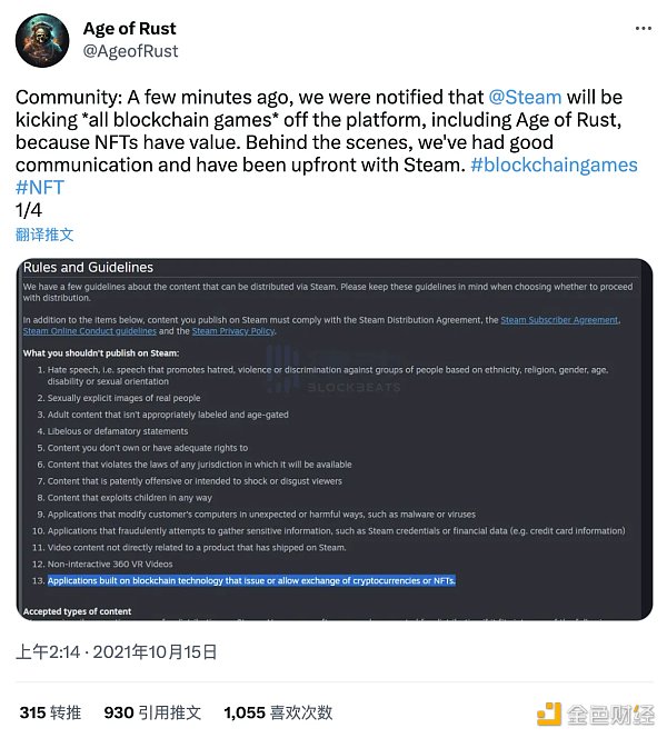2021 年 10 月 15 日,全世界最大的电子游戏分销平台 Steam 扩充了他们的上架规则,明确指出建立在发行并允许交换加密货币或 NFT 的区块链之上的应用,将不被允许在 Steam 上发布。