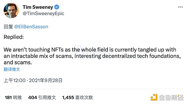 然而就在十几天前,Tim Sweeney 刚刚说过这样的话:「我们不会触及 NFT,因为那整个领域目前都被各种棘手的骗局、有趣的去中心化技术基金会和骗局纠缠在一起。」Epic Games 对于区块链游戏和 NFT 的看法究竟是怎样的?