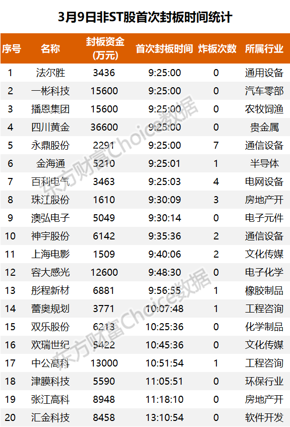 从首次封板时间角度看,今日20只非ST股中,法尔胜、一彬科技、播恩集团、四川黄金