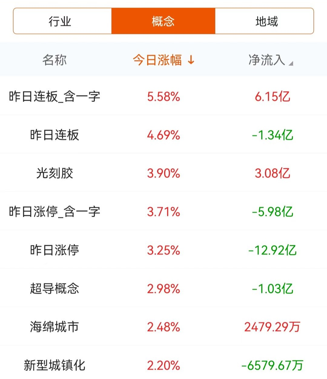 板块方面,光刻胶、室温超导、新型城镇化等板块涨幅居前,酒店旅游、教育、预制菜等板块跌幅居前。