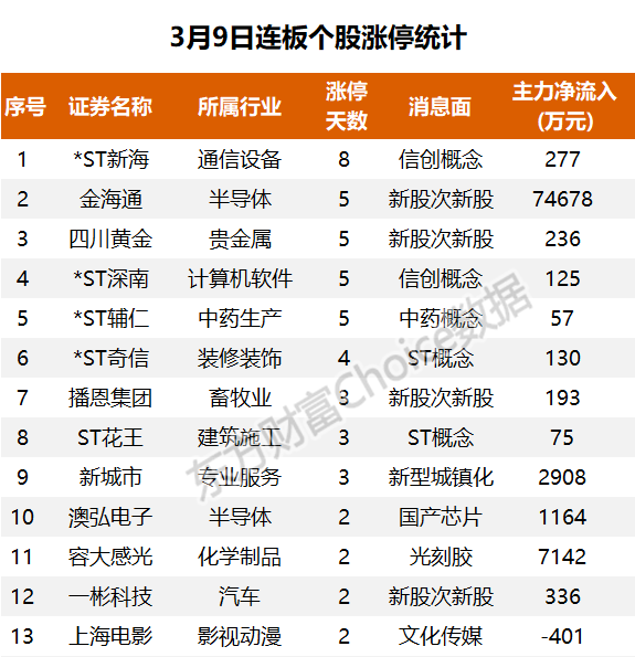 板块方面,数字经济概念中公高科6天5板;次新 芯片概念金海通、次新 黄金概念四川黄金5连板;新型城镇化概念新城市20CM三连板;光刻胶概念容大感光20CM两连板。