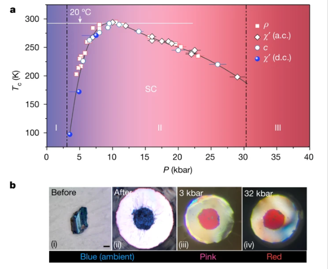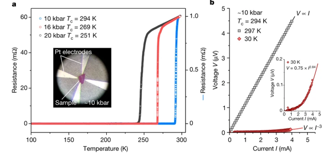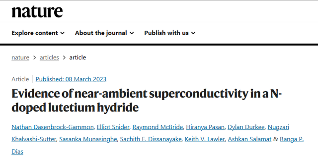 罗彻斯特大学的Dias团队宣称,他们发现了近常压的室温超导体,该超导体是由氢、氮、镥三种元素组成的三元相,该研究团队认为,其在大约10kbar(也就是1GPa,约相当于1万个大气压)下可以实现约294K(也就是约21℃)的室温超导电性。