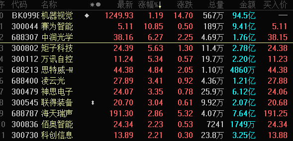 受益于消息利好影响,机器视觉概念指数今日高开高走,板块内赛为智能、中润光学、炬子科技、万讯自控、凌云光等股盘中出现明显拉升。