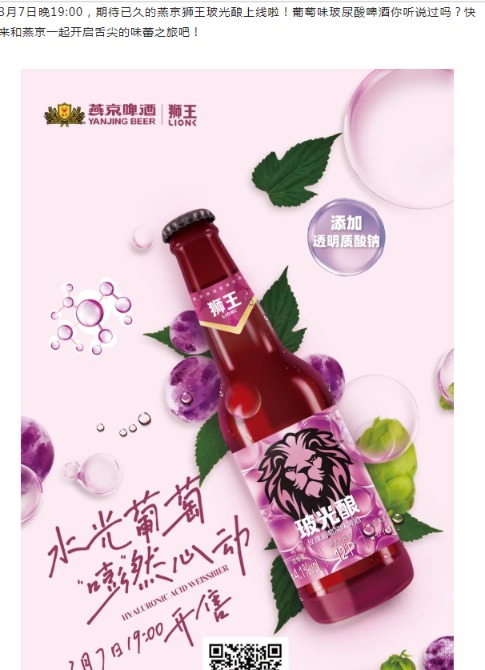 据燕京啤酒微信公众号显示,3月7日,燕京啤酒旗下首款透明质酸钠啤酒——狮王玻光酿玫瑰葡萄精酿啤酒,在京东、天猫、抖音等线上全渠道发售。