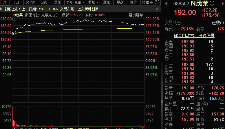 今日科创板新股N茂莱收盘大涨175.39%,盘中最高涨幅201.2%,一度临时停牌,全天成交额15.6亿元,换手率达到72.51%。公司是精密光学“隐形冠军”,是国内领先的工业级精密光学综合解决方案提供商。N茂莱发行价为69.72元,中一签可赚6.11万元,若按盘中最大涨幅计算,中一签可赚7.01万元。